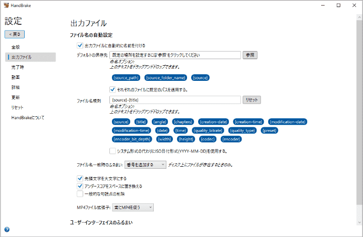 - 左メニューで「出力ファイル」に入り、右で「出力ファイルに自動的に名前を付ける」にチェックを入れます。そしてファイル名規則をカスタマイズしたり、デフォルトの保存先を設定したりします。