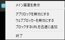 通知領域のアイコンで素早くアプリロックとウェブブロックの有効/無効を設定できます(パスワードが必要)。また、パスワード不要でブロックするURLを迅速に追加するのも可能です。