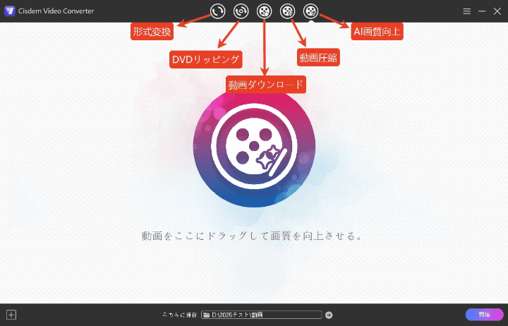 ステップ 1.Cisdem Video Converterを起動し、上の5つのアイコンの内一番右のアイコンをクリックして、AI画質向上機能に入ります。