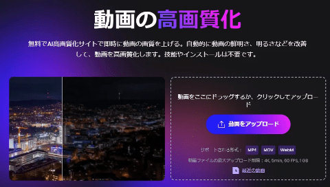 2.「動画をアップロード」をクリックして、高画質化したい古い動画をアップロードします。