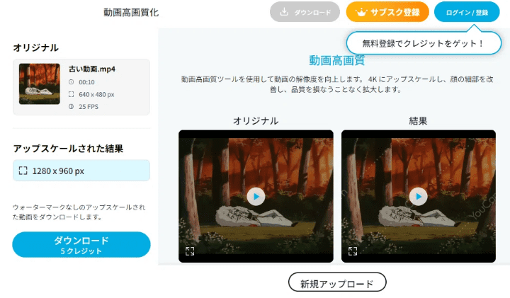 5.ダウンロードするのにログインする必要があり、「クレジット」もかかります。10秒の動画を高画質化するには5クレジットがかかり、1分間の動画を高画質化するには30クレジットがかかります。