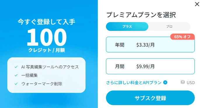 そして100クレジットは月間プランで9.99ドル(約1556円)かかります。