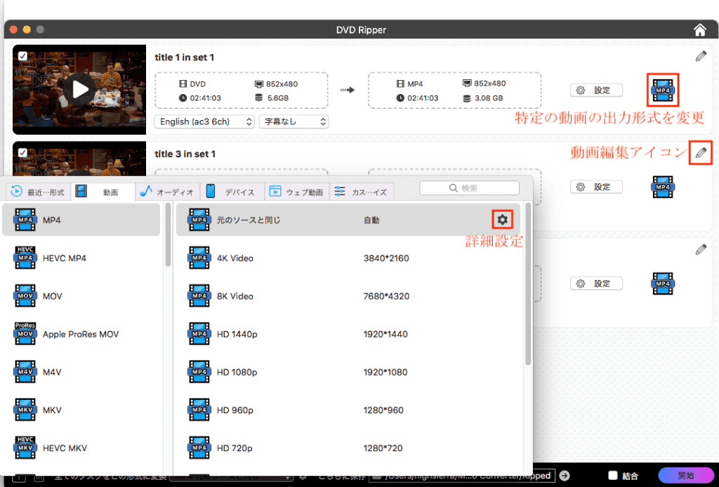 - DVDをMP4/4K MP4/HD MP4/HEVC MP4、MOV、AVI、MKV、M4Vなどにリッピングする
