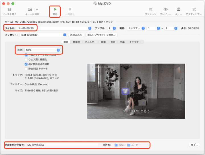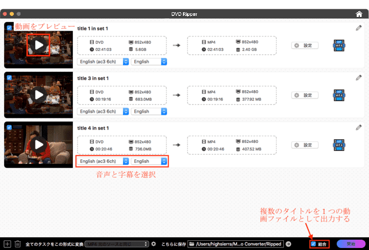 ボタン(Windows版の場合は「開始」)をクリックして、DVDをMP4、M4Vなどの形式にリッピングします。