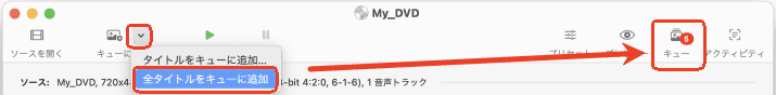 複数のタイトルがあり、一度にすべてのタイトルをリッピングしたい場合は、「キューに追加」>「全タイトルをキューに追加」をクリックします。