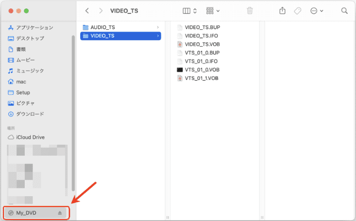 DVDのアイコンが表示されない場合は、Finderを開きます。FinderのサイドバーにそのDVDが見つかるはずです。クリックすればその中身にあるDVDフォルダが表示されます。