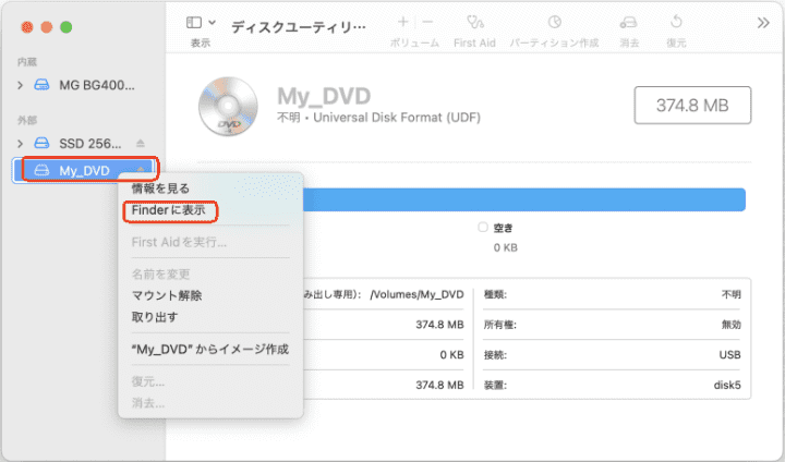 あるいは、Macの標準アプリ「ディスクユーティリティ」を起動し、そのサイドバーでDVDを見つけ、右クリックしてFinderに表示できます。
