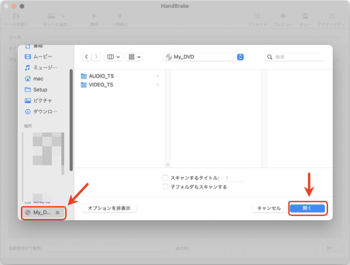 3. HandBrakeを起動します。自動的にソースを選択する画面に入りますので、ここでステップ 3で見つけたDVDまたはDVDフォルダを選択して「開く」をクリックします。あるいは、「キャンセル」をクリックして、ステップ 2のアイコンを直接ソフトのメイン画面にドラッグ&ドロップします。