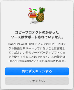 4. コピーガード付きのDVDに対応できないとの旨の警告が表示されます。「構わずスキャンする」をクリックします。