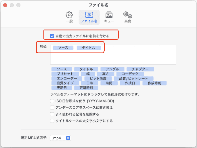 8. 「ファイル名」タブに移動し、「自動で出力ファイルに名前を付ける」にチェックを入れます。そして下の「形式」でファイル名の命名規則を設定します。