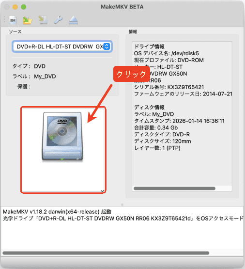 5. 接続しているDVDを自動的に検出し、メイン画面に表示してくれますので、クリックすれば分析を開始できます。