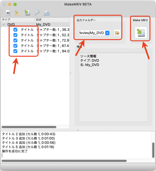 4. 全てのタイトルを選択します。「保存先フォルダ」で保存場所を設定して、「RUN」をクリックすればDVDをリッピングできます。