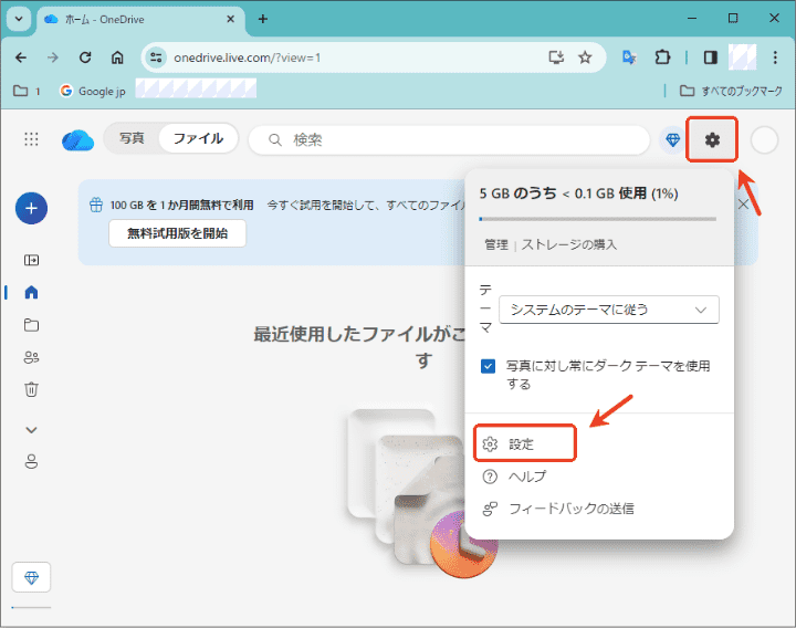 1.ブラウザでOneDriveにアクセスし、ログインします。右上隅の歯車アイコンをクリックし、「設定」をクリックします。