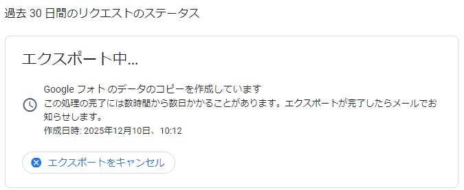 - 写真が少ない場合は、しばらく待てばエクスポートが終了しますので、直接ページを再読み込みします。そして「最新のエクスポート」で「ダウンロード」をクリックして、Google Photosの写真をダウンロードします。