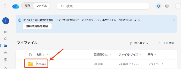 13.エクスポート完了後、OneDriveにアクセスすれば「Pictures」フォルダーが表示されます。そのフォルダーには先ほどGoogleフォトから移行された写真が保存されています。