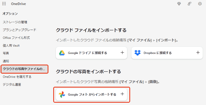 2.左カラムから「クラウドの写真やファイルのインポート」タブに入り、「Googleフォトからインポートする」をクリックします。