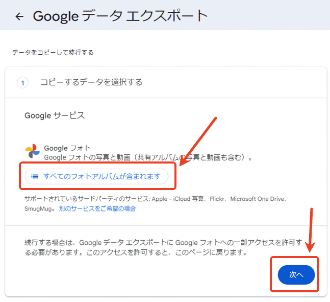 4.新しいページが開き、「Googleデータエクスポート」ページが表示されます。「すべてのフォトアルバムが含まれます」をクリックすることで移行するアルバムを選択できます。選択完了後、「次へ」をクリックします。