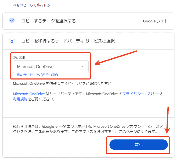 8.「次に移動」のところで移行先を「Microsoft OneDrive」に設定し、「次へ」をクリックします。