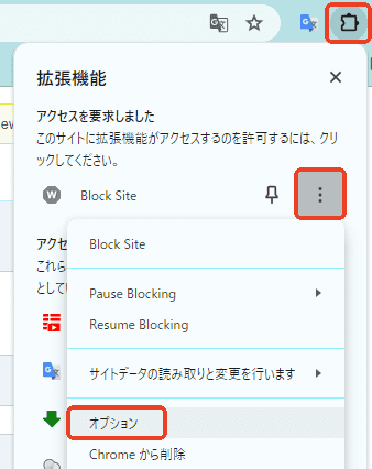 5.あるいは、拡張機能アイコンをクリックし、「Block Site」を見つけ、右にある縦の三点アイコンをクリックして、「オプション」をクリックします。