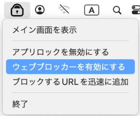 - すべてのサイトのブロックを一時的に解除したい場合は、上部のメニューバーでこのソフトのアイコンをクリックして、「ウェブブロッカーを無効にする」を選択してください。もちろん、解除するのにパスワードが必要です。