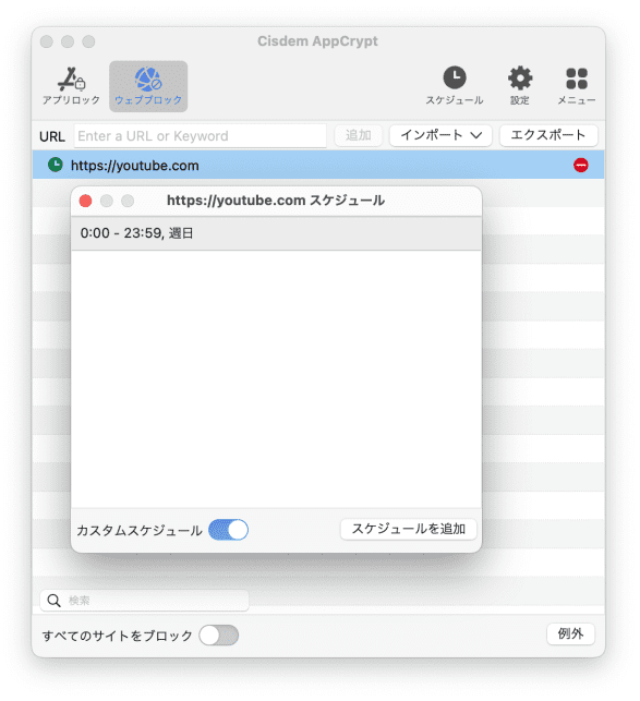 ただSafariでサイトをブロックするだけならば、MacやiPhoneの標準機能を使えば簡単にできます。しかし、サイトブロックに関する機能が完備していないため、複雑な操作はできません。Macの場合、サイトブロックもアプリロックもできて、スケジュールで管理できる上、ワンクリックで全てのサイトをブロックできるソフトCisdem AppCryptがオススメです。パスワードをかけられますし、システム環境設定やアクティビティモニタをロックすることもでき、他人による強制終了の心配もありません。