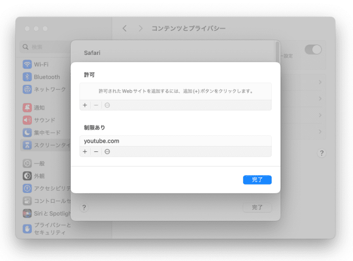 5. 「制限あり」の下の「+」をクリックして、Safariでブロックしたいサイトを追加し、「完了」をクリックします。これでそのサイトへアクセスできなくなります。