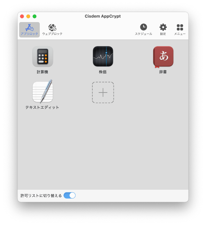 Cisdem AppCryptは、UIが極シンプルですが機能豊富なソフトです。Mac、Windows PC、iPhone、Androidスマホで利用でき、使い方も非常に簡単です。パソコンにあるアプリにロックをかける「アプリロック」機能とウェブサイトをブロックする「ウェブブロック」機能、そしてアプリとサイトの使用時間を制限する「スケジュール」機能はその主要機能となります。この部分では、3つの主要機能について詳しく紹介します。