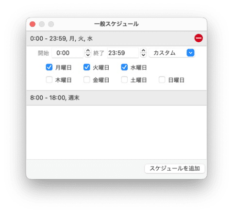 特定のアプリに独自のスケジュールを設定することもできます。そのアプリをクリックして、左上に表示される小さな時計のアイコンをクリックすれば、スケジュールの設定画面が表示され、画面左下の「カスタムスケジュール」をオンにし、右下の「スケジュールを追加」をクリックすればそのアプリの独自のスケジュールを設定できます。独自のスケジュールを持つアプリは時計アイコンが緑になります。
