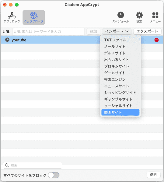 ネットで調べものが必要で、Chromeなどのブラウザの使用を制限できない場合は、ウェブサイトをブロックする機能でYouTubeなど気が散るサイトをブロックしましょう。「インポート」をクリックしてTXTファイルで一度に複数のURLを追加でき、カテゴリ別に動画サイトやゲームサイトを一気に追加することができます。また、キーワードでサイトをブロックできます。