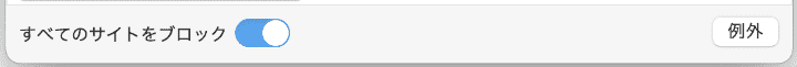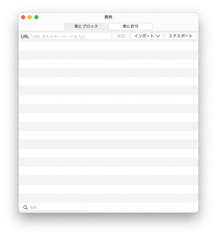 画面右下隅の「例外」ボタンをクリックすれば、「常にブロック」リストと「常に許可」リストを管理できます。広告や有害サイトを「常にブロック」リストに、勉強と仕事用のサイトを「常に許可」リストに追加しましょう。