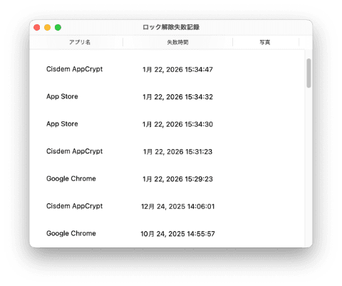 アプリのロックを解除しようとする時はパスワードを要求されます。この機能を有効にすれば、パスワードを間違えた時は自動的にパソコンのカメラで写真をとります。同時に、開こうとするアプリと、失敗した時間も一緒に記録されます。誰がこっそりゲームを遊ぼうとしたのか、あるいはパソコンの情報を覗こうとしたのかを確認できます。