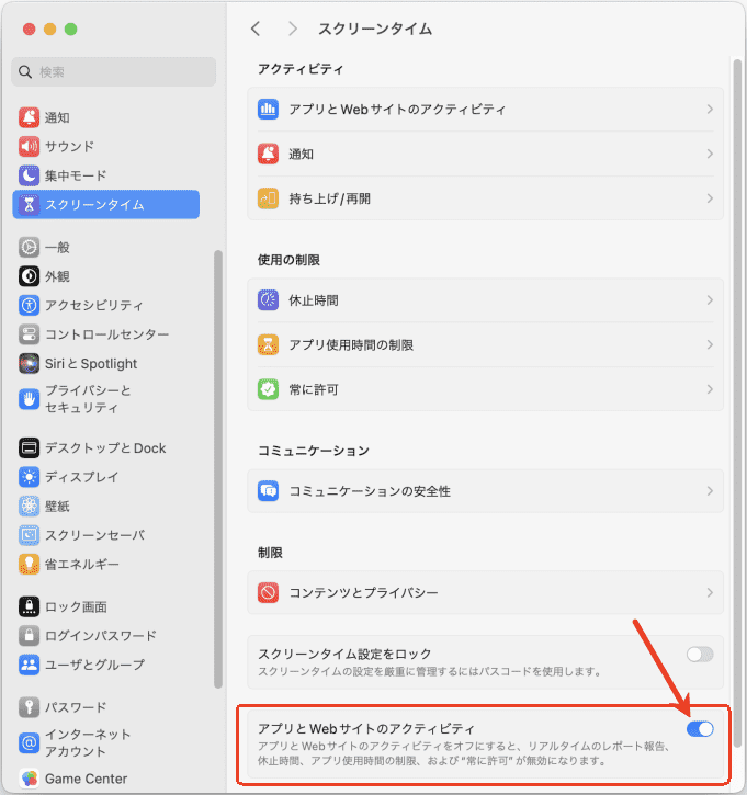 - システム設定を開き、左のサイドバーで「スクリーンタイム」を見つけ、クリックして入ります。「アプリとWebサイトのアクティビティをオンにする」機能が有効になっている場合、こんな画面が表示されます。「休止時間」に入ります。