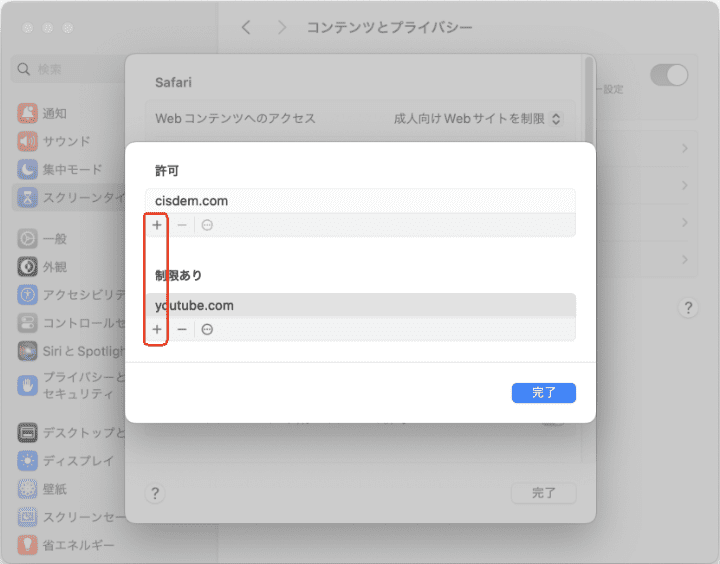 - 「成人向けWebサイトを制限」を選択した場合、成人向けサイトだと判断されたサイトはブロックされます。そして「カスタマイズ」をクリックして許可リストと制限ありリストにぞれぞれサイトを追加し、許可するサイトとブロックするサイトを手動で追加できます。