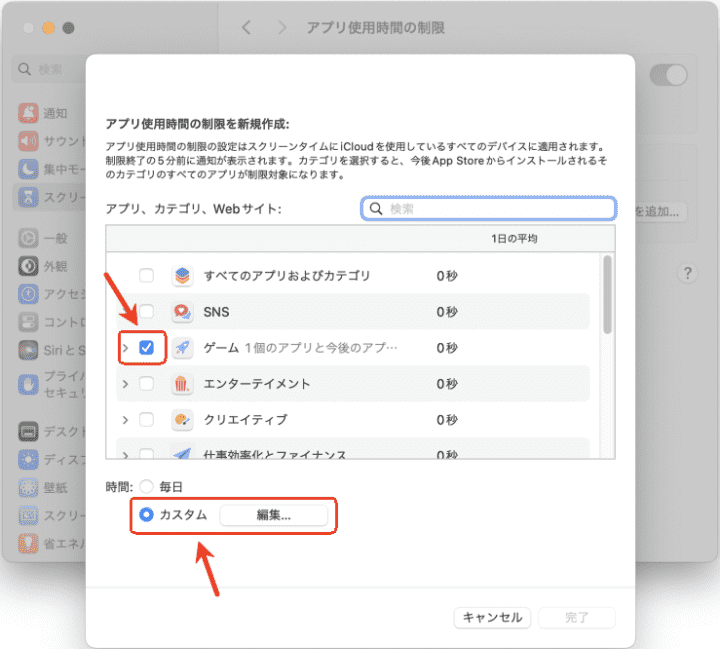 - 制限するアプリを選択して、下の「時間」で「カスタム」を選択し、「編集」をクリックします。