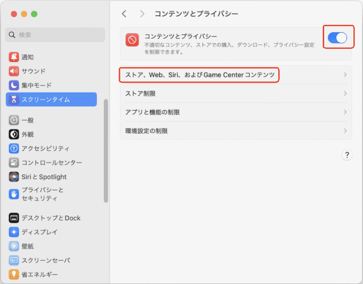 例えば特定のサイトや成人向けサイトをブロックしたい場合は、「コンテンツとプライバシー」を有効にして、「ストア、Web、Siri、およびGame Centerコンテンツ」に入ります。![]()