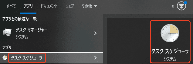 - Windowsの検索機能で「タスク」を検索し、「タスクスケジューラ」を見つけて、ダブルクリックして起動します。