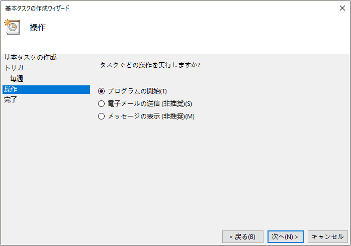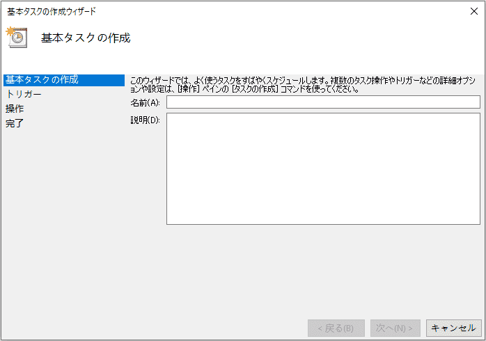 - 「基本タスクの作成ウィザード」に入ります。そのタスクの名前を設定し、必要に応じて「説明」のところに詳細情報を書くこともできます。設定完了後、「次へ」をクリックします。