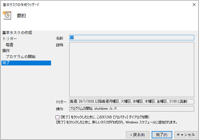- タスクの要約が表示されます。内容を確認して、「完了」をクリックします。