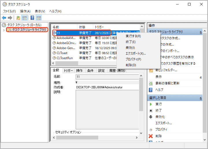 - これでタスク作成完了です。左のカラムで「タスク スケジューラ ライブラリ」をクリックして、中のカラムでそのタスクを確認できます。