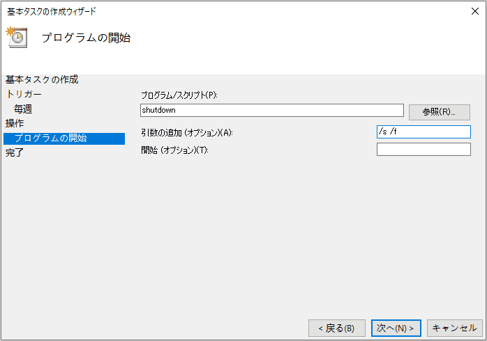 - 「プログラム/スクリプト」に「shutdown」と入力し、「引数の追加(オプション)」に「/s /f」と入力します。「/s」と「/f」の間で半角スペースがありますので注意してください。そして「次へ」をクリックします。