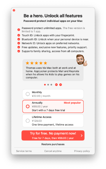 - MacにAppLockerをインストールして起動します。「Try for free」プランを選択すれば7日間無料で体験できます。