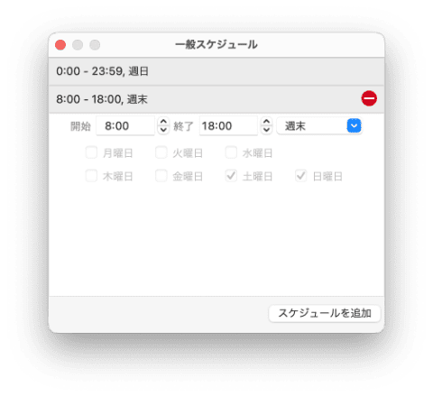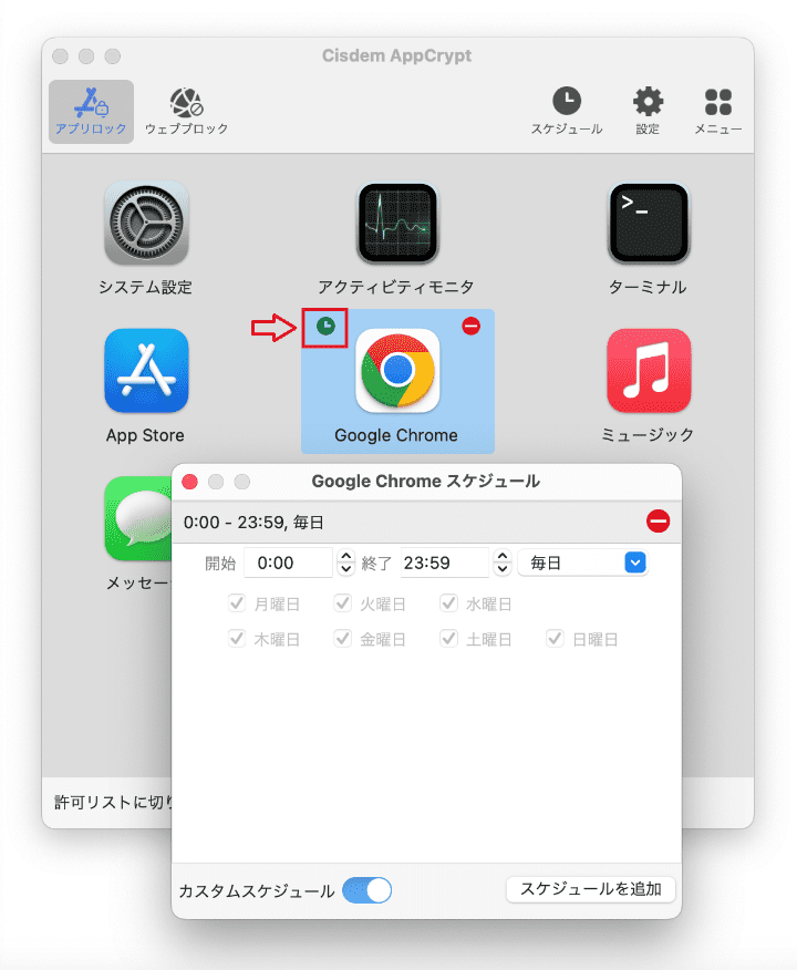 特定のアプリに独自のスケジュールを設定したい場合は、そのアプリを選択して、左上の小さい時計アイコンをクリックして、そのアプリの独自のスケジュール設定画面を開き、「カスタムスケジュール」をオンにすれば設定できます。
