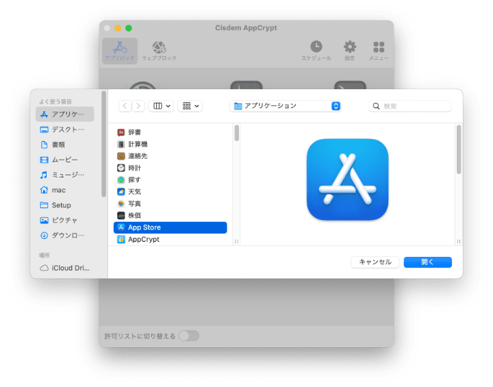 6. 「+」アイコンをクリックし、ロックしたいアプリを選択して、「開く」をクリックします。これでMacのアプリをロックできます。