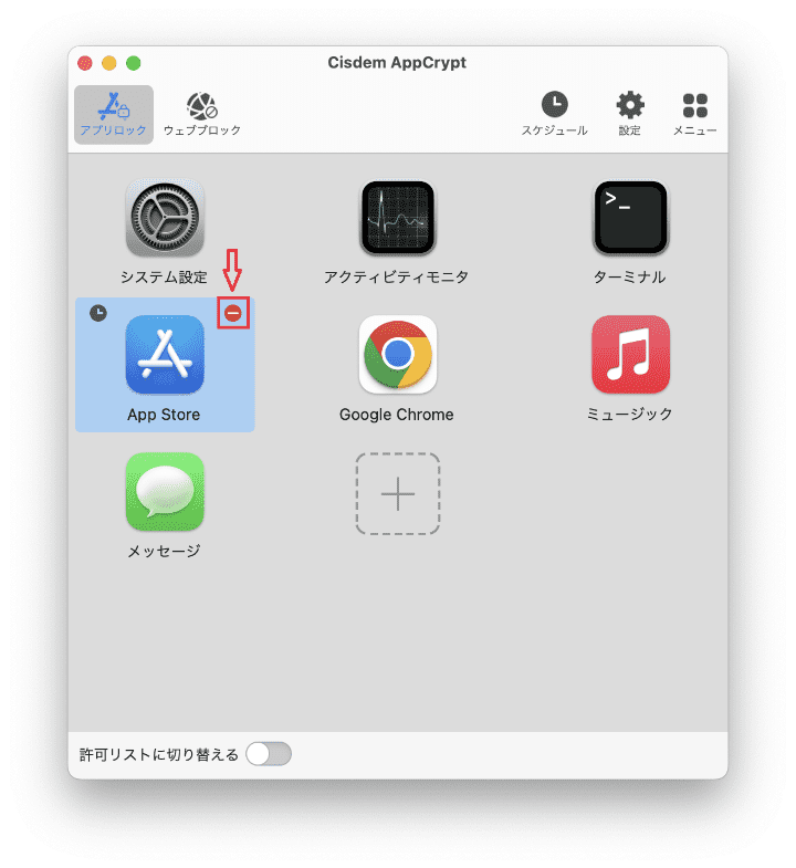 ロック解除方法:アプリをロックする必要がなくなった場合は、ロックを解除しましょう。アプリを選択して、右上隅の小さい赤いマイナスボタンを押せば削除できます。