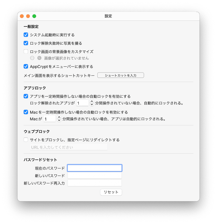 自動ロック機能:メイン画面の右上の「設定」ボタンを押せば、設定画面に入ります。「アプリロック」欄に自動ロック機能があります。この機能を有効にすると、パスワードでロックを解除されたアプリは、一定時間操作されないと、自動的に再ロックされます。Macから一定時間離れるとアプリを自動ロックする機能もあります。