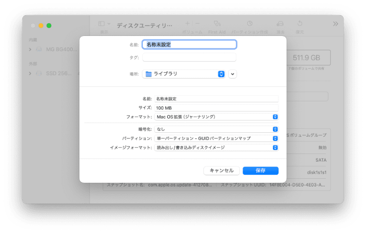 - 一つ目の「名前」に、作成するディスクイメージの名前を入力します。