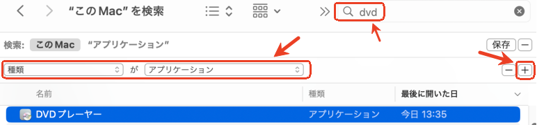 - 見つからない場合は検索機能を使いましょう。条件を「種類」>「アプリケーション」に設定すればすぐ出てきます。