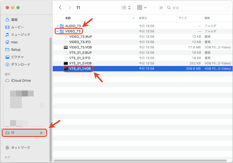 - Finderで「DVD」>「VIDEO_TS」フォルダに入ります。複数の「.VOB」ファイルが表示されます。