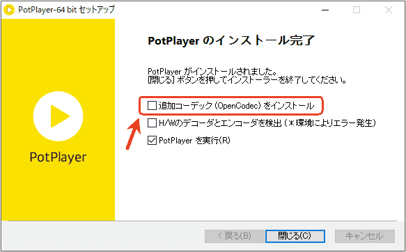 - インストール完了後、「追加コーデック(OpenCodec)をインストール」の追加インストールがありますが、これはマルウェアやウイルスではありませんのでご安心ください。このコーデックがないと一部のDVDは再生できない場合がありますので、インストールするのがおすすめです。