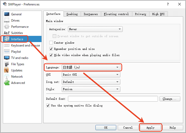 - 「Interface」>「Language」で表示言語を日本語に変更し、「Apply」をクリックすればOKです。